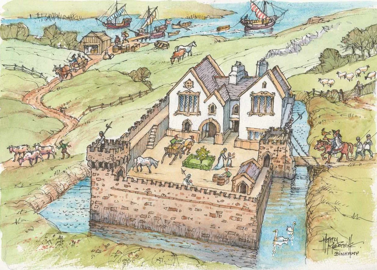 An artists impression of Binhamy fortified Manor House in the 1335s. In that year Sir Ralph de Blanchminster obtained the permission of the King to crenelate his manor house. This was the fashionable thing to do at that time and was a statement of power and enhancement of his position in society.